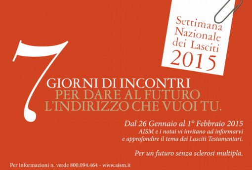 Il calendario degli incontri e le informazioni sulla Settimana Nazionale AISM dei Lasciti sono disponibili al numero verde AISM 800-094464 e sul sito dell’Associazione Italiana Sclerosi Multipla www.aism.it. Sempre al numero verde dedicato si potrà anche richiede la Guida AISM scritta in collaborazione con il Consiglio Nazionale del Notariato: “L’importanza di fare testamento: una scelta libera e di valore”. Uno sguardo in materia di diritto che, con un linguaggio semplice e chiaro, aiuta a districarsi in una materia tanto complessa, come quella delle successioni, aiutando le persone a fare scelte consapevoli.