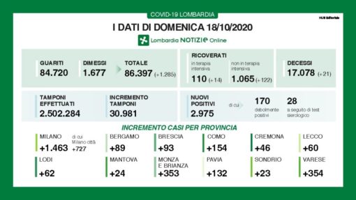 ERBA – Sono 2.975 i nuovi positivi con 30.981 tamponi effettuati, per una percentuale pari al 9,6%.