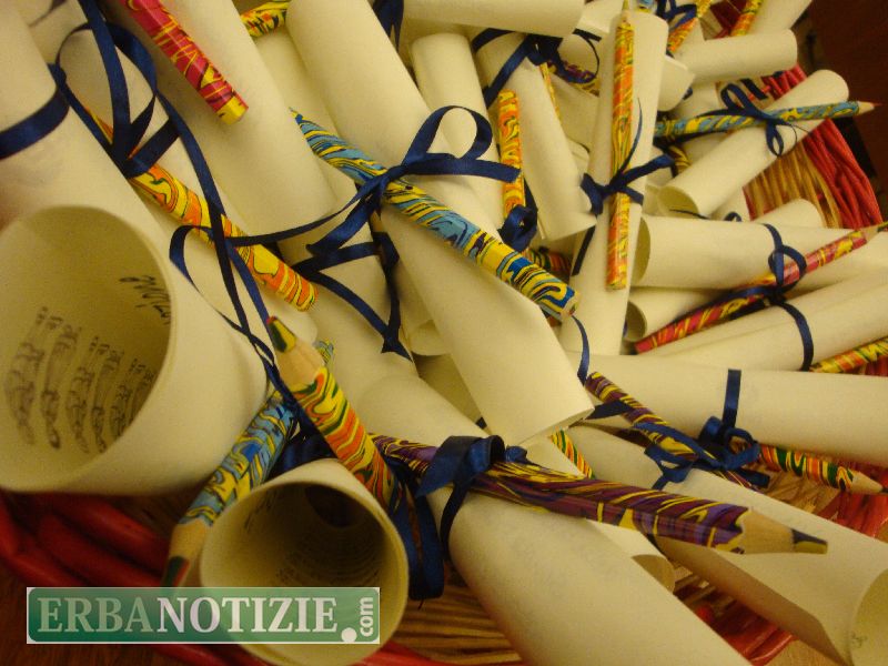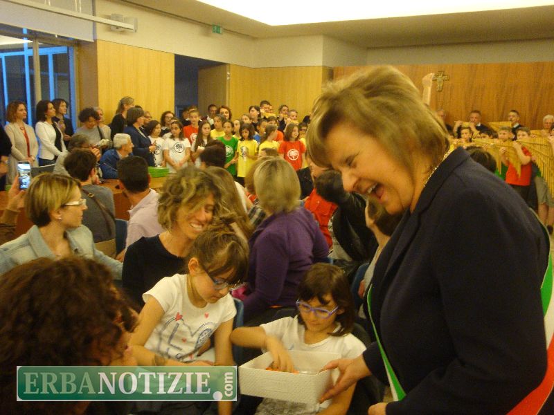 Presenti anche l’assessore alla Cultura e all’Istruzione Franco Brusadelli, l’assessore allo Sport Angelo Cairoli e il presidente de I Bej Angelo Molinari che, insieme al sindaco Tili e al presidente Redaelli, hanno chiamato le insegnanti Caterina Monteleone, Norma Schincariol, Liliana Folini, Elvira Valsecchi, Piera Moioli, Titti Grecò e il direttore de I Bej Enrico Pina per consegnare loro il libro della Città di Erba in segno di ringraziamento per il loro lavoro svolto.