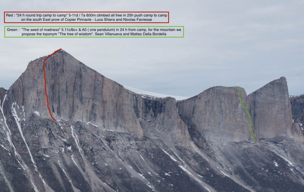 Dopo un meritato riposo e prima di imboccare la via di casa, per il quintetto c’è stato ancora spazio per compiere due ascensioni su una parte situata dall’altra parte della valle rispetto al Great Sail Peak. Aperte le vie “24 h round trip camp to camp” (600m – 7a) ad opera di Schiera e Favresse e “The seed of medness” (6c) da parte di Della Bordella e Villanueva.