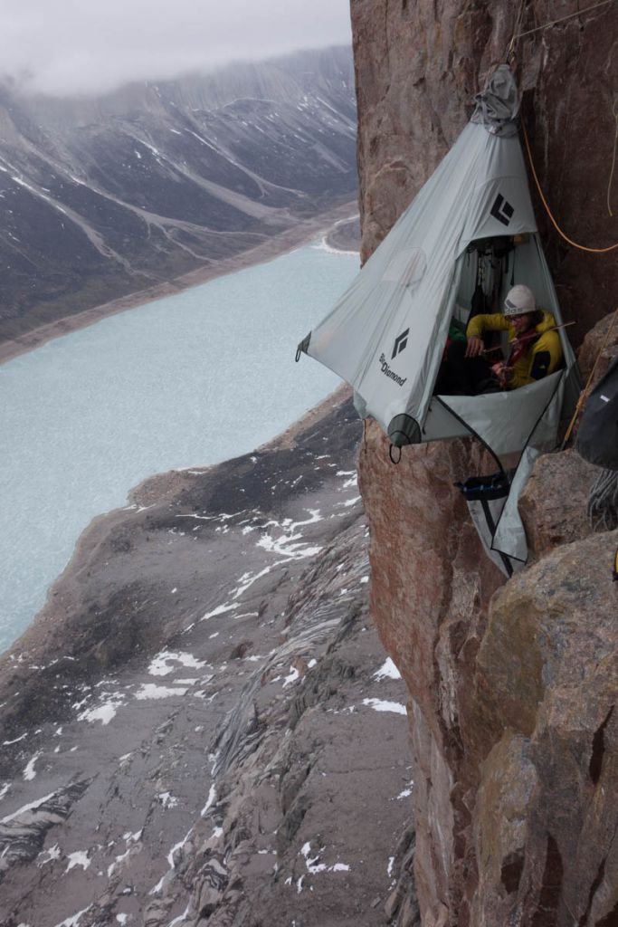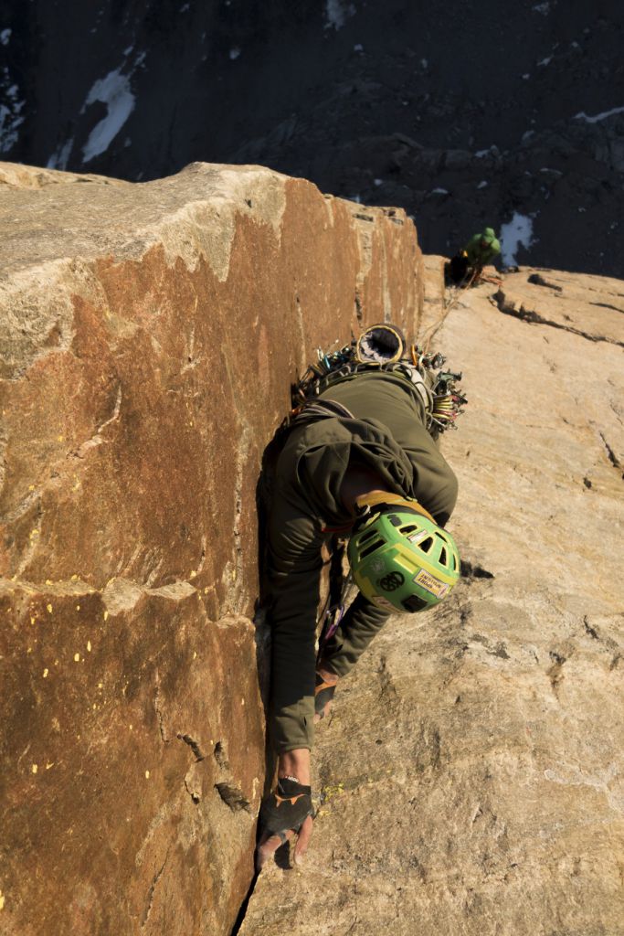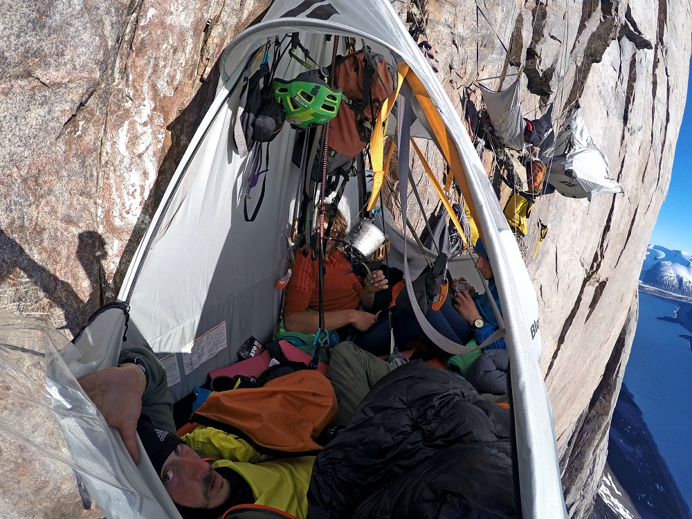 I cinque hanno proseguito raggiungendo la zona del campo base. Qui, hanno iniziato a trasportare il materiale in parete per poi attaccare la big wall, conquistando la cima il 4 luglio. Tre le vie aperte, la prima battezzata “Coconut connection” in onore della miriade di alimenti al cocco che i due belgi avevano nello zaino e dei quali anche i tre Ragni si sono potuti deliziare (1100 m – 7c); quindi Schiera e Della Bordella hanno aperto “Mascalzone Latino” (più di 600 m di parete con difficoltà 7b) mentre Favresse e Villanueava hanno battezzato “The Northwest passage” (700m – 7a+ più 350m first tier).